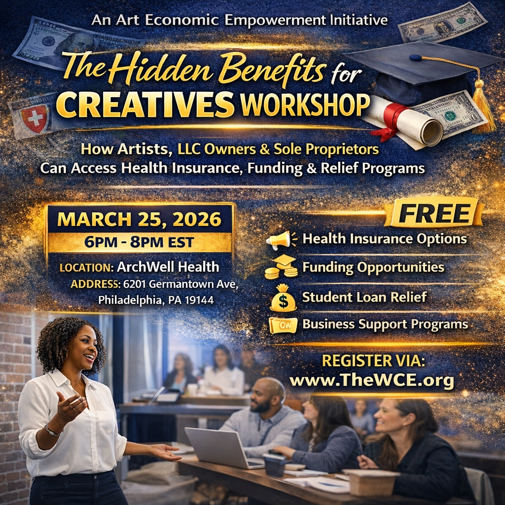 - Event Tags:art economic empowerment initiative, artist entrepreneurship education, artist financial empowerment, artists and freelancers workshop, benefits for independent contractors, benefits for self employed, business development for artists, creative business support, creative business workshop Philadelphia, creative economy workshop, creative entrepreneur training, Creative Entrepreneurs, creative industry professional development, creative small business support, Creative Workforce Development, economic empowerment for artists, financial literacy for creatives, financial resources for creatives, funding opportunities for artists, grants for artists and creatives, health insurance for freelancers, LLC owners resources, Philadelphia entrepreneur workshop, resources for freelancers Philadelphia, self-employed health insurance options, small business funding resources, sole proprietor benefits, student loan relief programs, support programs for small business owners, The Women's Coalition for Empowerment
